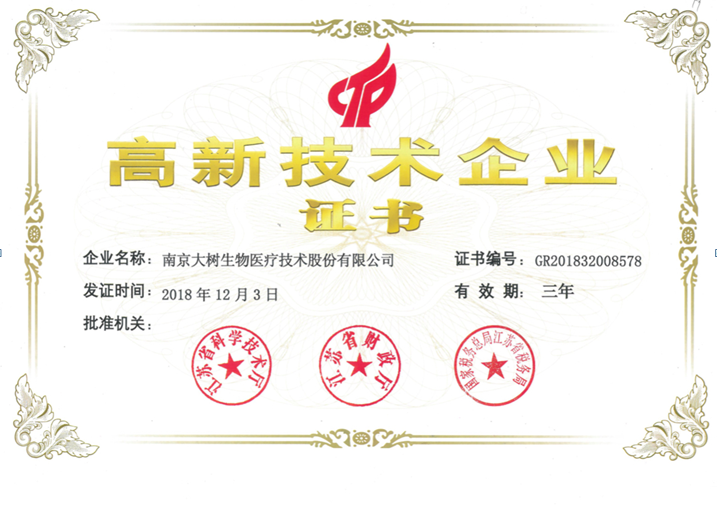 近日,我公司獲得由江蘇省科學技術廳、江蘇省財政廳、國家稅務總局江蘇省稅務局聯(lián)合頒發(fā)的“高新技術企業(yè)”證書,由此正式邁入國家高新技術企業(yè)行列。南京大樹生物醫(yī)療技術股份有限公司是一家集研發(fā)、生產、銷售為一體的專業(yè)體外診斷試劑醫(yī)療器械公司,公司秉承“質量為先、信譽為重、以人為本、精益求精”的質量方針,通過我們的專業(yè)技能和不懈努力竭力為廣大客戶提供創(chuàng)新優(yōu)質的產品及完善的售后服務!